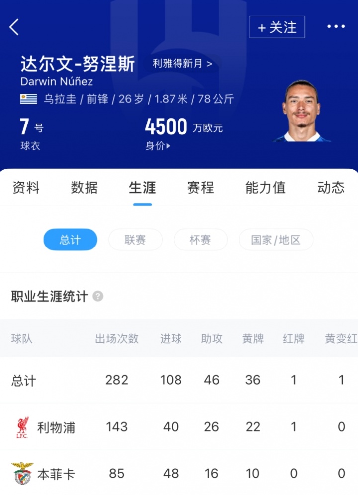 努涅斯自2022年从本菲卡转会以来,共为利物浦出场143次。上赛季他出战了30场联赛,但其中仅8次首发,并在球队得到英超冠军的赛季中打入5球。努涅斯现年26岁,现在德转估值4500万欧。
