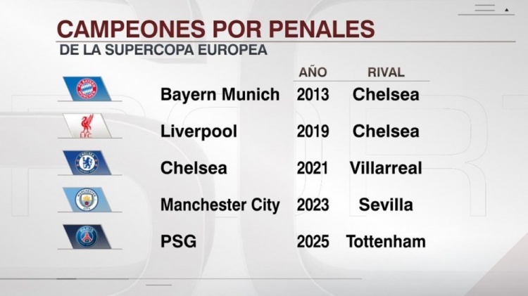据ESPN统计,巴黎是欧超杯历史第5支通过点球大战夺冠的球队,此前4支是拜仁(2013)、利物浦(2019)、切尔西(2021)和曼城(2023)。
