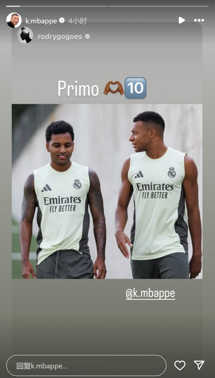 罗德里戈社媒晒出与姆巴佩的合照,配文:“昆玉。”姆巴佩转发了这条动态。