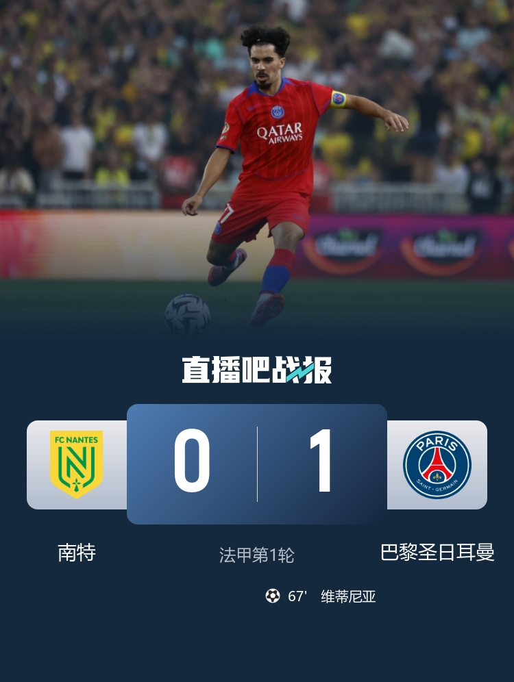 法甲第1轮,巴黎圣日耳曼1-0降服南特,维蒂尼亚远射制胜。
