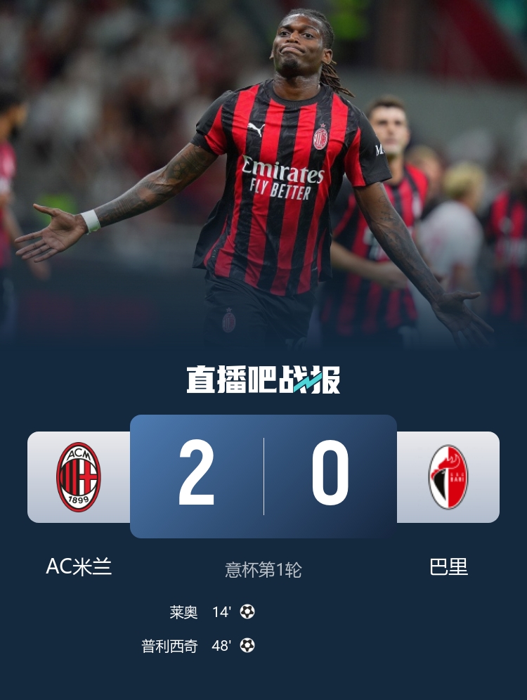 意大利杯第1轮,AC米兰2-0降服巴里,莱奥、普利西奇破门,莫德里奇献技正赛首秀。