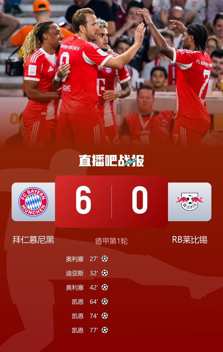 德甲首轮,拜仁6-0横扫莱比锡拿下开门红,凯恩首轮就戴帽,新援迪亚斯1球2助进展出色,奥利塞斩获两球。