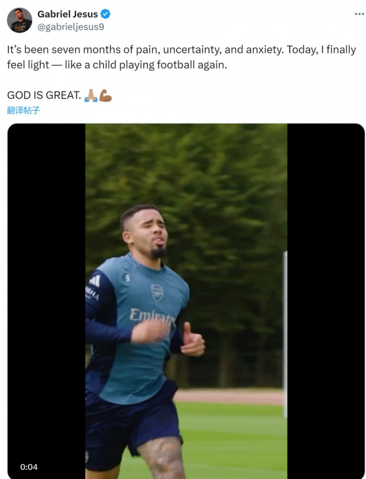 8月25日讯 阿森纳时尚热苏斯更新社媒动态,晒出复原实验的视频。