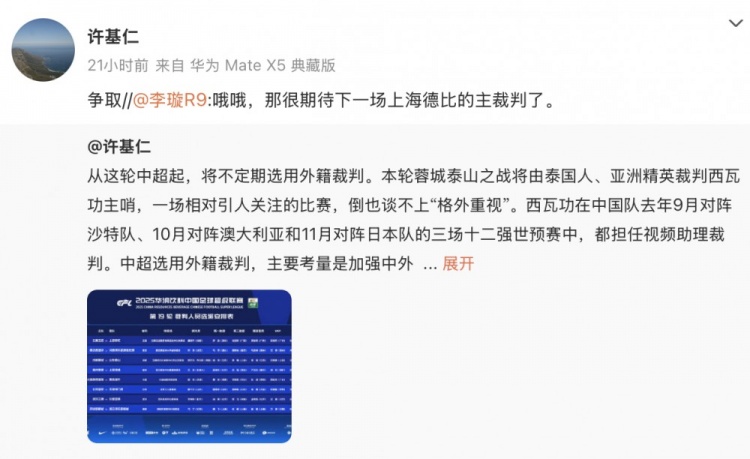 8月3日讯 关于网罗上号令下一轮中超上海德比邀请洋哨的声息,足协副主席许基仁在个东谈主社媒赐与了回话。