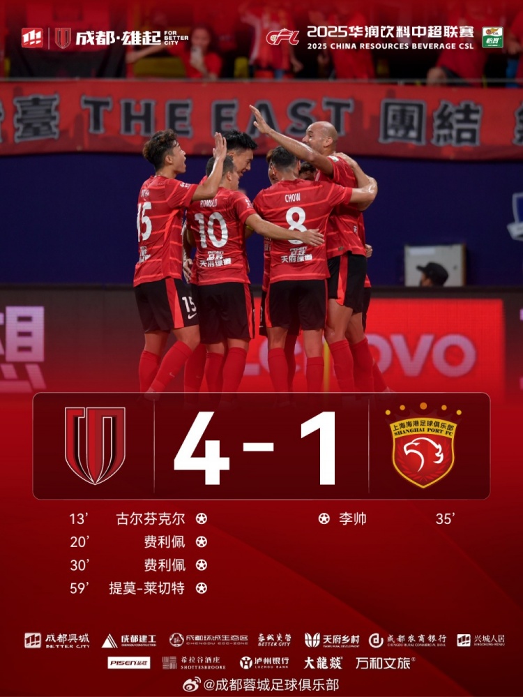 大胜!费利佩双响、韦世豪献助攻,成王人蓉城4-1降服上海海港