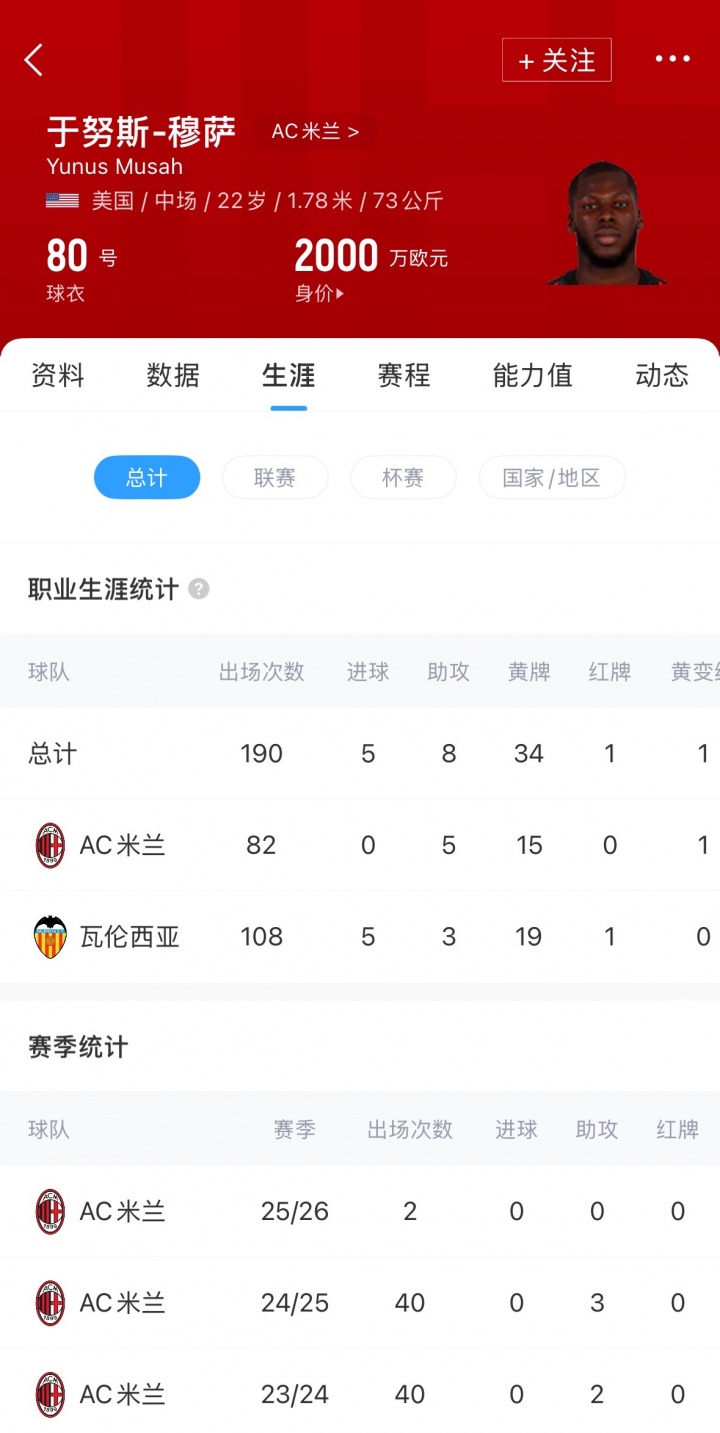 穆萨现年22岁,司职中场,加盟米兰后球员盘算推算出场82次,孝顺5助。现在穆萨德回身价为2000万欧元。