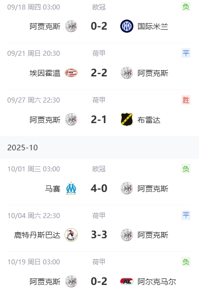 本赛季阿贾克斯欧冠3场全败,丢了11个球,只打进了1个点球。在36支球队中只消本菲卡相同3连败,但本菲卡在净胜球上大幅向上阿贾克斯。
