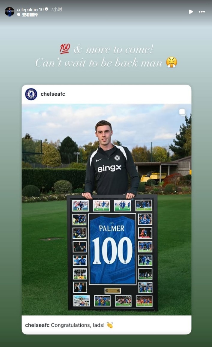 帕尔默写说念:“100场!接下来还有更多!哥们我仍是等不足要归来赛场了!”