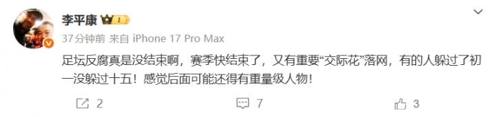 李平康:“足坛反腐果真没法例啊,赛季快法例了,又有勤劳“交际花”就逮,有的东谈主躲过了月吉没躲过十五!嗅觉后头可能还得有分量级东谈主物!”