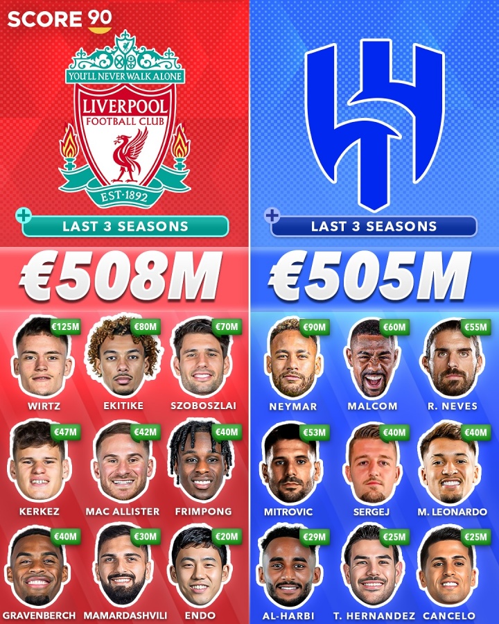 2023/24赛季于今,俱乐部转会总干预前十(单元:欧元)↓