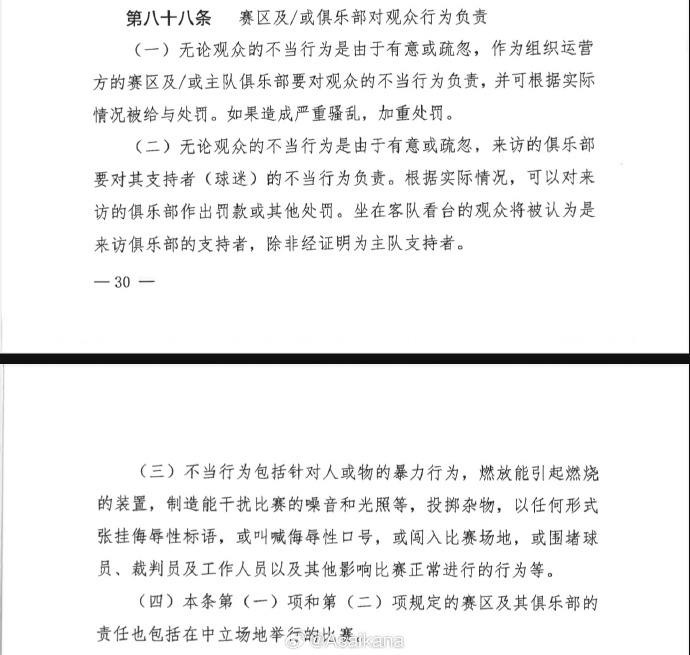 在本年新发布的中足联步骤说念德准则里,“报怨”(包含种族、肤色等报怨举止)是荒芜加多的实质,这亦然反映了海外足联严打赛场种族报怨举止的要求。此前,功绩联赛种族报怨事件多发,由于勤快相应条件或根据,后果多不显着之或以其他根由替代。但最新文献明文规章,球迷有报怨举止的,一朝根据可信(一般指可供缓助阐述其举止的视频摄像、东说念主证、比赛官员的发扬、听证记载等),其所缓助的俱乐部将被处甚至少50万元的多数罚金,并将根据步骤说念德准则进行进一步不断(关闭部分看台或沿途空场等)。