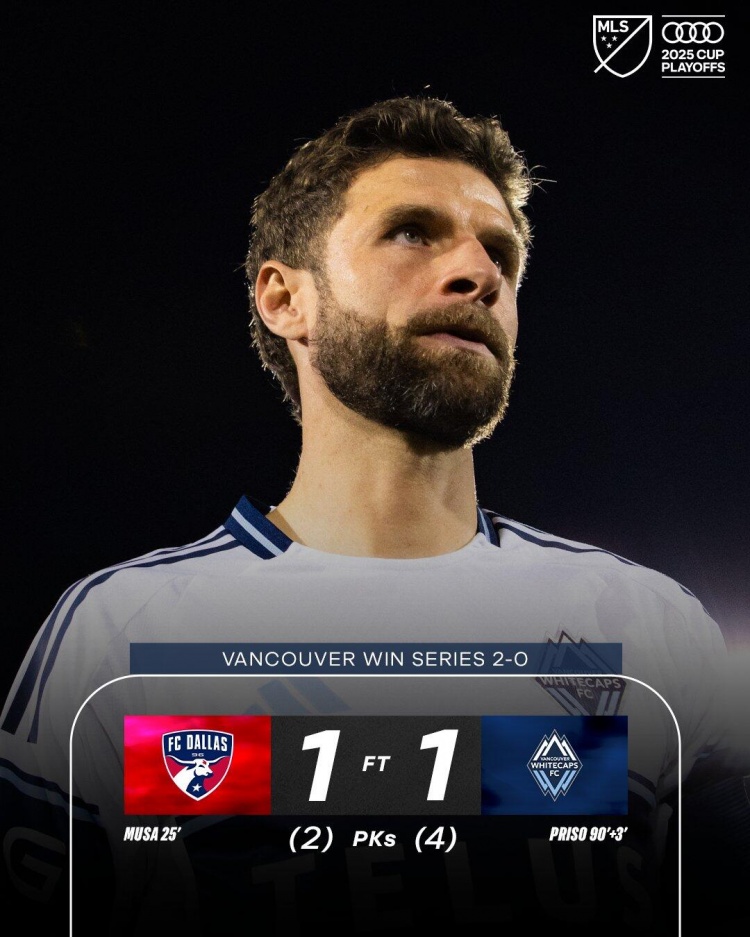 11月2日讯 在好意思职联季后赛第二场,温哥华白浪1-1战平达拉斯FC,过程点球大战温哥华白浪4-2奏效晋级下一轮。