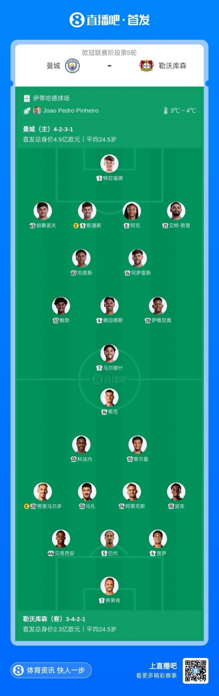11月26日讯 欧冠联赛阶段第5轮,曼城主场迎战勒沃库森,赛前两边首发公布。【曼城本场大幅交替,马尔穆什、赖因德斯、胡桑诺夫统共先发,哈兰德、福登、B席镇守替补;药厂方面,希克、格里马尔多、宽萨先发出战,本·塞吉尔、埃切维里替补待命。】