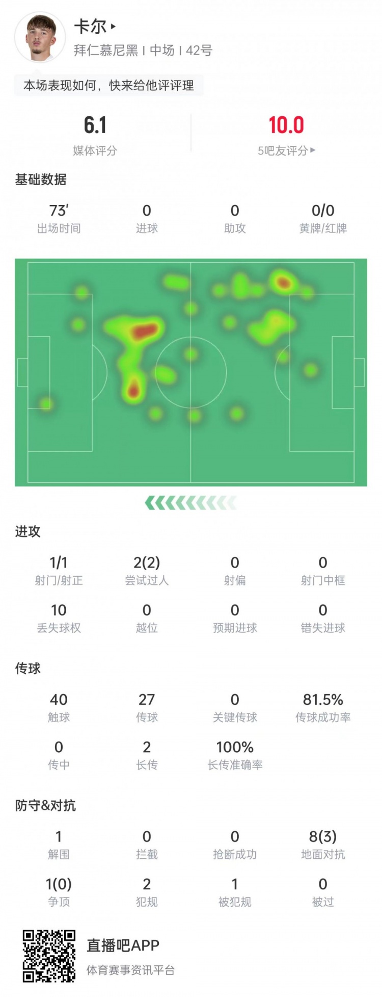 17岁伦纳特·卡尔此役为拜仁首发出战,完成2次过东说念主,2脚长传总共收效,他当选本场比赛最好球员。