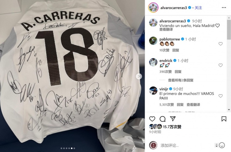 今夏加盟皇马的A费此役踢满全场,匡助球队取胜,他在外交媒体上晒出首秀球衣,上头签满了队友的名字。
