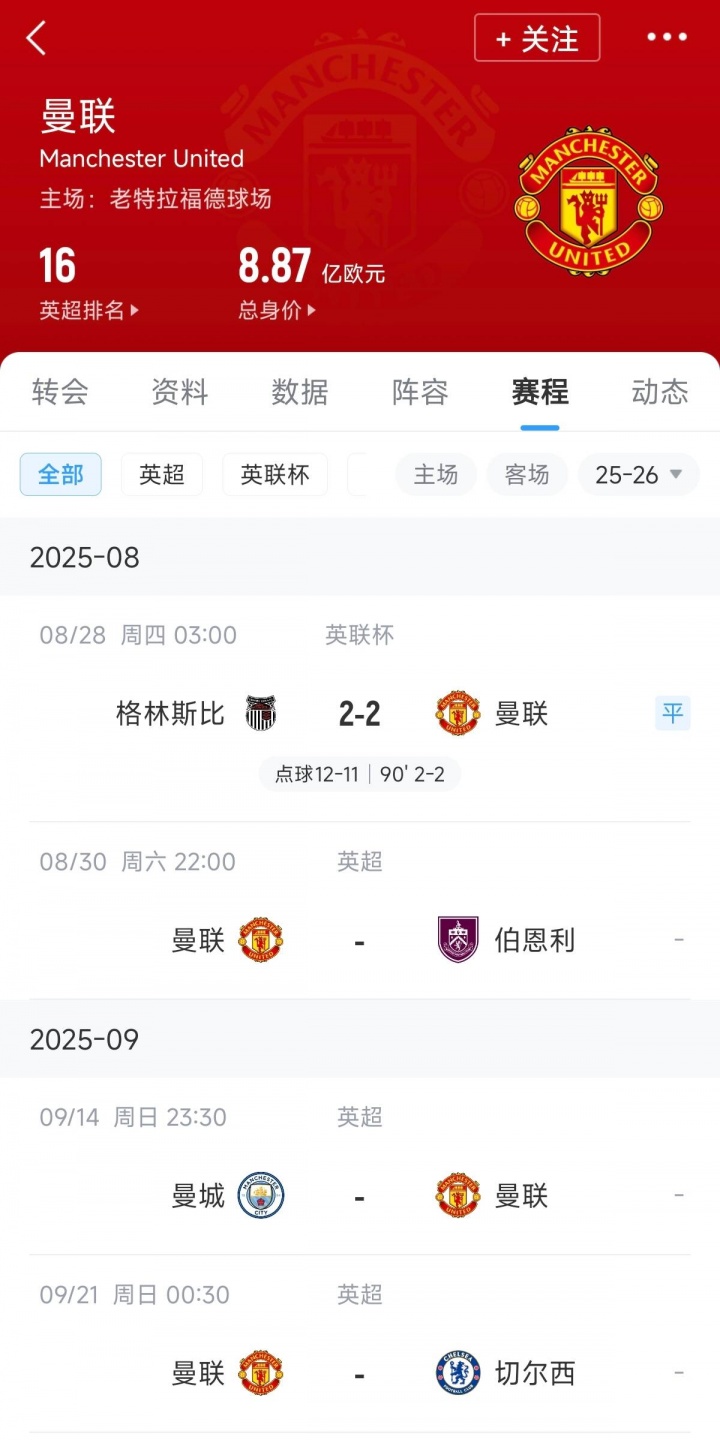 08月28日讯 英格兰联赛杯第2轮,曼联点球大战不敌格林斯比,无缘晋级。