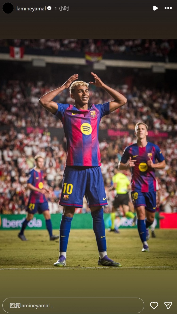 新王加冕,亚马尔社媒晒本轮“戴金冠”庆祝进球算作像片