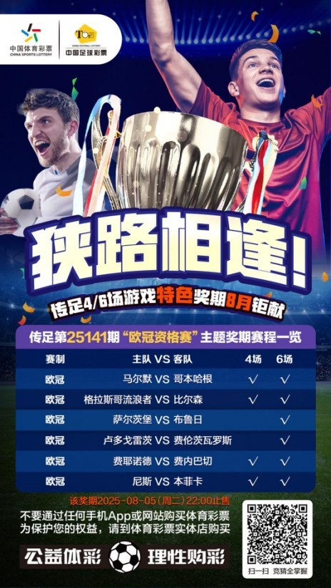 第25141期传足4/6场游戏特质奖期照旧于2025年8月3日20:00开售,将于2025年8月5日22:00停售,并于8月7日开奖,其中马尔默VS哥本哈根、格拉斯哥流浪者VS比尔森、费耶诺德VS费内巴切和尼斯VS本菲卡为4场进球游戏竞猜赛事。