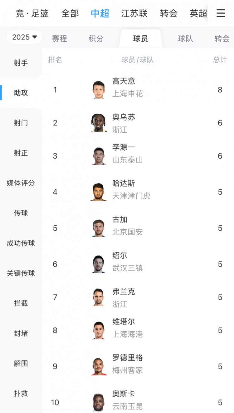 中超最新助攻榜如下(步履:球员名,服从球队,助攻数):