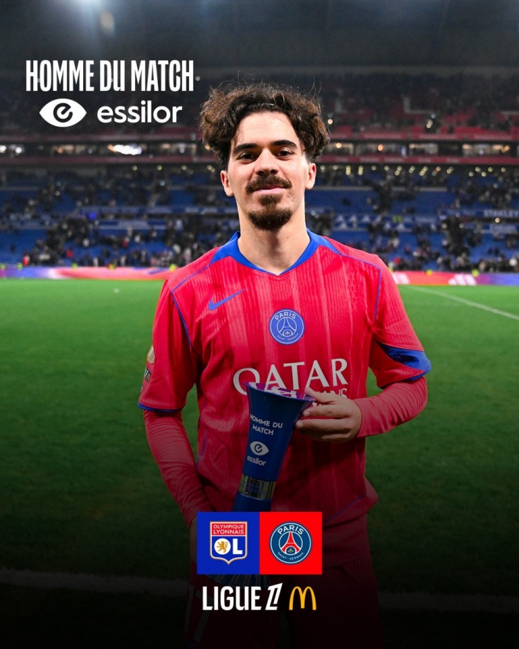 助攻双响!维蒂尼亚当选巴黎vs里昂全场最好球员