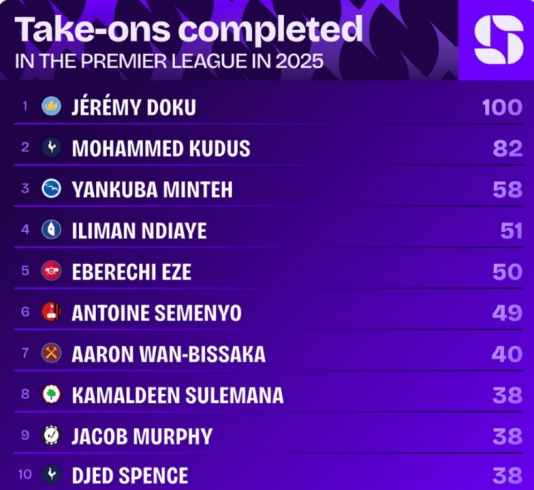 11月10日讯 英超第11轮比赛,多库完成7次过东谈主,打进1球,匡助曼城3-0打败利物浦。据Squawka统计,多库是2025年首位英超告捷过东谈主达到100次的球员。