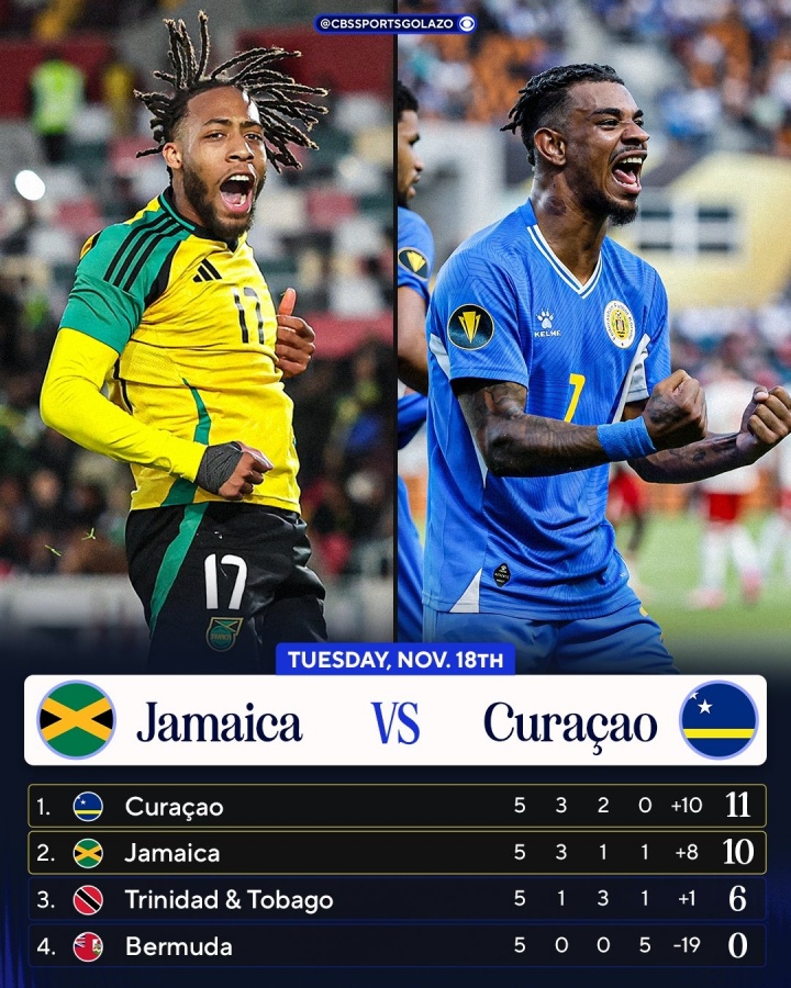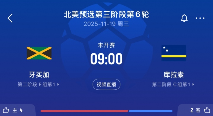 5轮事后,库拉索11分小组第一,向上小组第二牙买加1分,下轮两队将径直交手,库拉索不败即纵贯寰宇杯,比赛于北京技艺11月19日9点在牙买加主场进行。两队首回合交手,库拉索主场2-0打败牙买加。