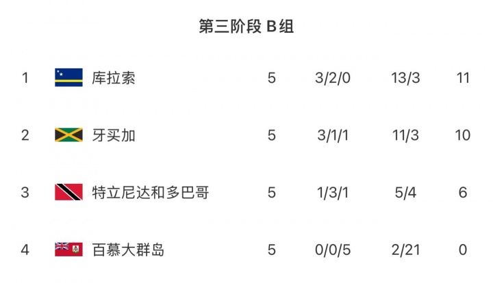 11月14日讯 北好意思预选第三阶段第5轮, 库拉索客场7-0狂胜百慕大群岛,牙买加客场1-1遭特立尼达和多巴哥绝平。