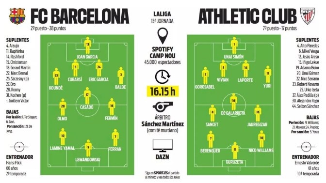 11月22日讯 北京时辰11月22日23:15,2025-26赛季西甲联赛第13轮,巴塞罗那将镇守主场迎战毕尔巴鄂竞技。赛前,《逐日体育报》撰文分析了弗里克当今的聘请,展望了本场比赛球队可能的首发声势。