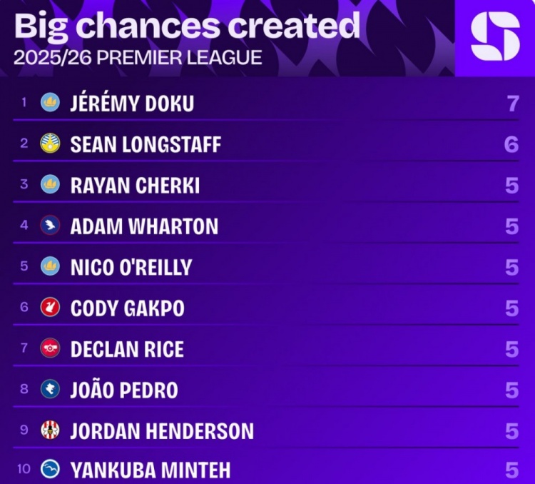 本赛季英超创造紧要契机榜:多库7次居首,谢尔基、赖斯5次