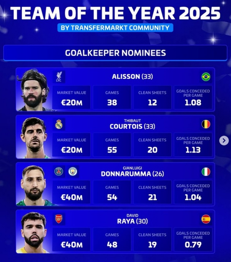 德转评比2025最好门将名单:阿利松、库尔图瓦、多纳鲁马、拉亚