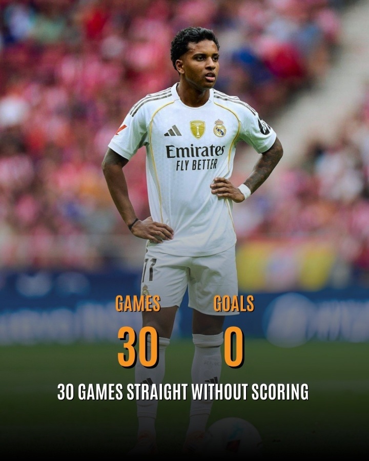 罗德里戈在皇马遇到衔接30场的进球荒,追平了皇马123年队史上最长的先锋不进球场次记载,此前马里亚诺曾经衔接30场比赛莫得进球。