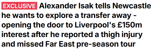 07月24日讯 邮报独家音信,伊萨克见告纽卡我方念念寻求转会,这为利物浦引进他掀开了大门。