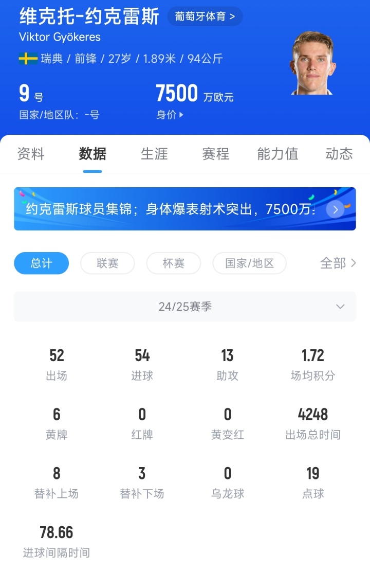现年27岁的约克雷斯上赛季为葡萄牙体育出战52场比赛,收货54球13助。这位瑞典国脚现身价7500万欧。