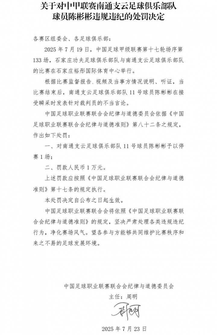 07月24日讯 中足联官方发布措置公告,南通支云球员陈彬彬赛后采访时发表针对评判员的不妥言论,被停赛1场,罚金1万元。