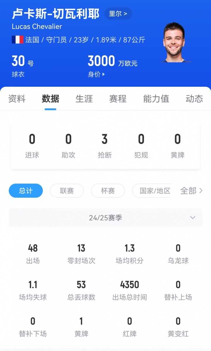 现年23岁的法国门将切瓦利耶上赛季为里尔出场48次,取得13场零封,场均失球1.1个。目前其德转身价达3000万欧元。