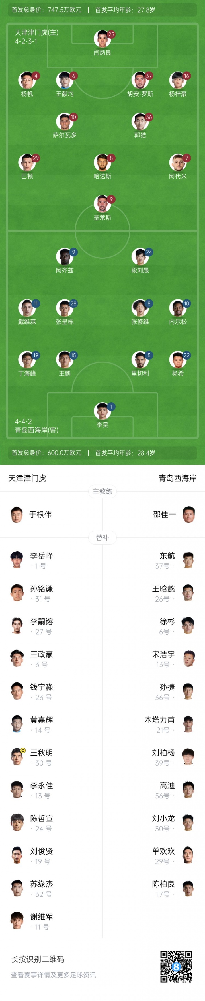 青岛西海岸替补:26-王晗懿、37-东航、6-徐彬、13-宋浩宇、17-陈柏良、21-木塔力甫、29-单欢欢、30-刘小龙、36-孙捷、39-刘柏杨、56-高迪