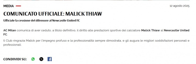 米兰官方写道:“俱乐部宣布已经将佳夫的运动代表权永久性转让给纽卡斯尔联,俱乐部感谢佳夫在效力期间所展现出来的努力和职业精神,并祝愿他在个人和职业生涯中都取得圆满成功。”