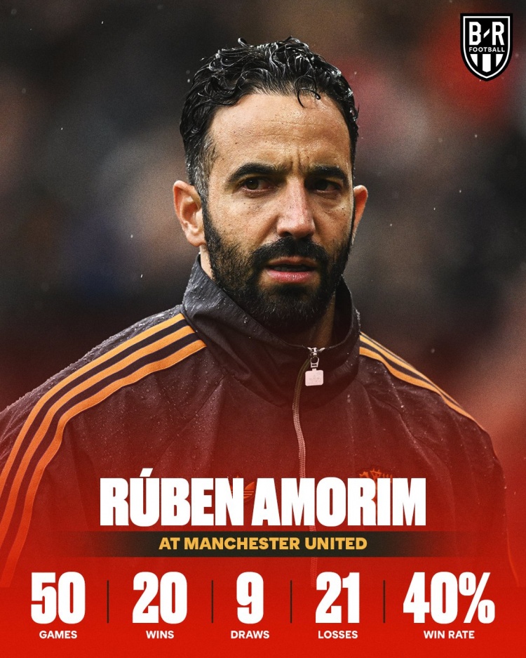 美媒B/R Football晒出海报,海报中罗列出阿莫林执教曼联以来的战绩:50场比赛,20胜9平21负,胜率40%。