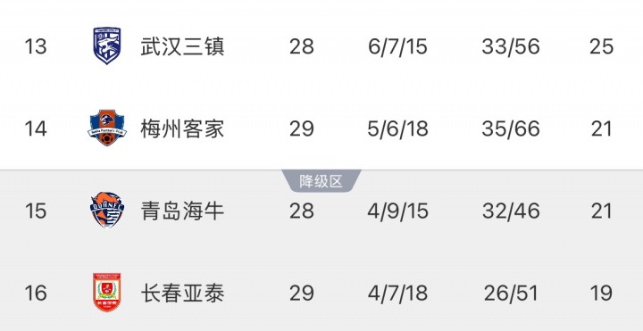 目前的中超积分榜上,亚泰和梅州两队仅剩1轮未赛,两队分别落后三镇6分和4分,因此三镇提前两场确保不降级。