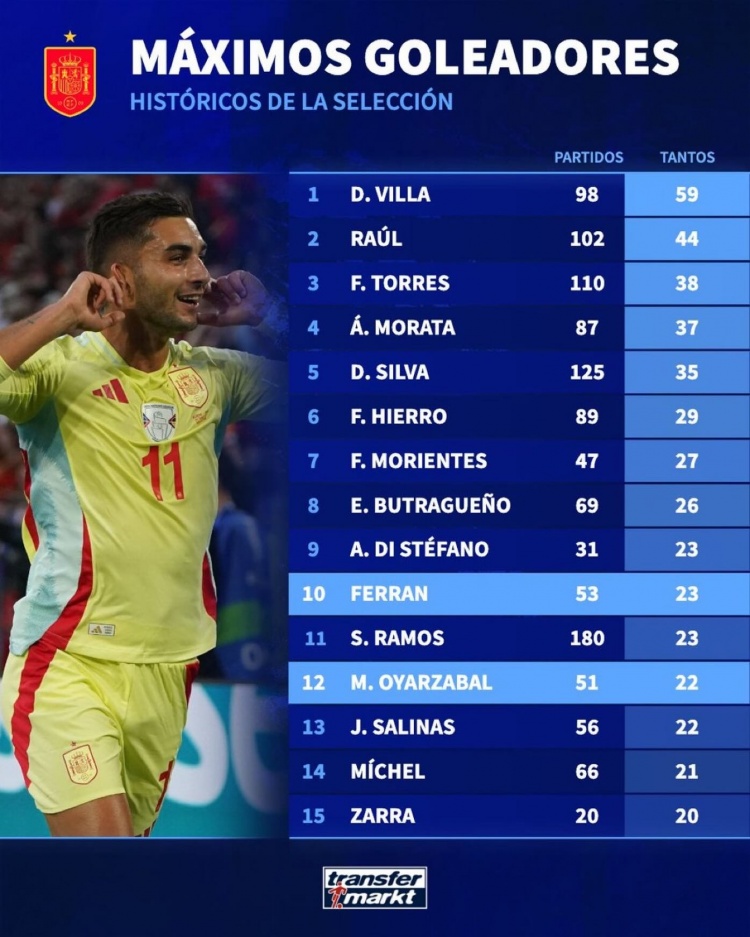 西班牙队史射手榜:比利亚59球居首,费兰23球、奥亚萨瓦尔22球