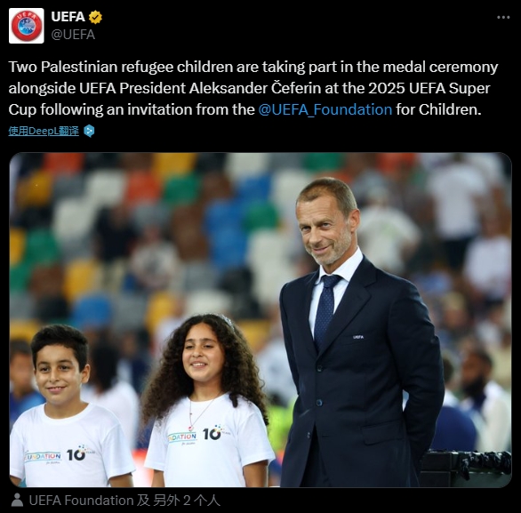 两名巴勒斯坦苍生儿童受邀,与切费林一同插足欧超杯受奖典礼