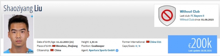 此前德转判辨,刘邵子洋解放身离开奥地利乙级球队SV霍恩,“加盟”拜仁二队。