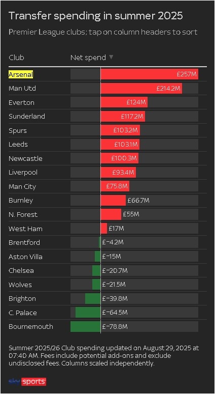 2025年夏令英超俱乐部转会净开销榜