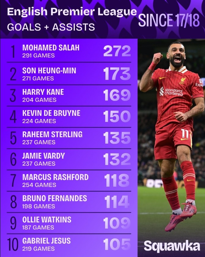 同时断层杰出!17-18赛季以来,萨拉赫英超291场成功参与272球