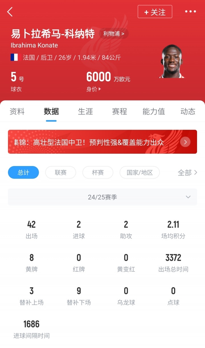 科纳特,现年26岁,法国中卫,上赛季代表利物浦出战42场比赛,孝顺2球2助,当今德回身价6000万欧。