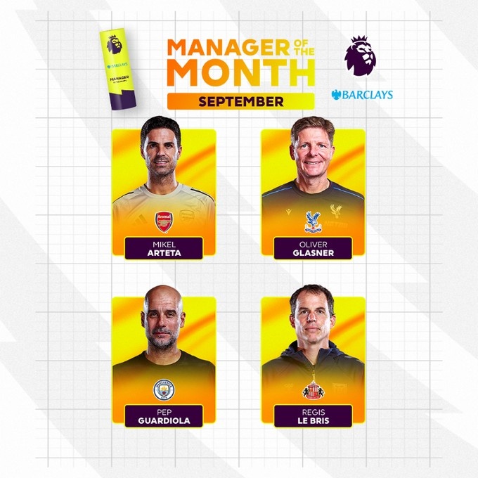英超9月最好教唆候选:阿尔特塔、格拉斯纳、瓜迪奥拉、勒-布里斯