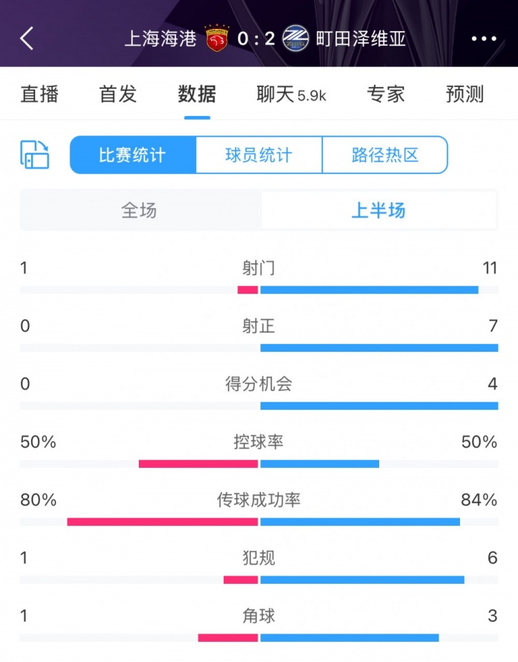 10月21日讯 亚冠精英联赛东亚区第3轮比赛,海港主场迎战町田泽维亚。上半场,海港暂时0-2过期。半场数据方面,海港也处于全面下风。