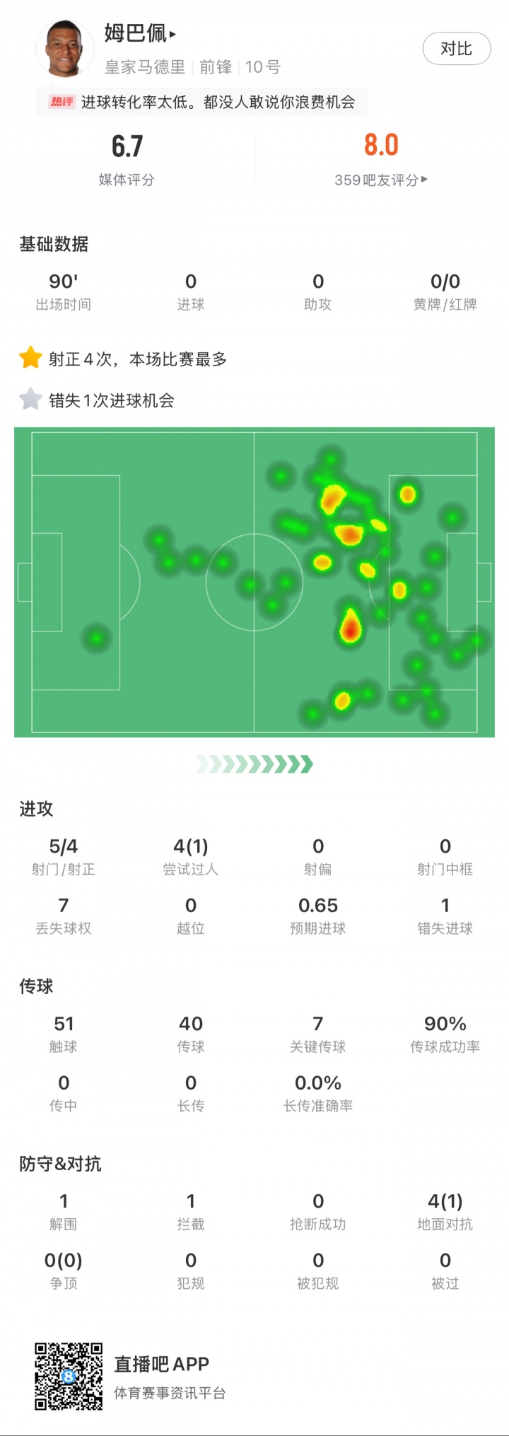 在对阵尤文的比赛中,姆巴佩打满全场,5次射门4次射正,错失1次良机,预期进球0.65。