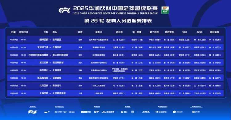 10月24日讯 中超官方公布第28轮裁判安排,乌兹别克斯坦裁判坦塔舍夫法则泰山vs海港,马宁法则国安vs海牛。