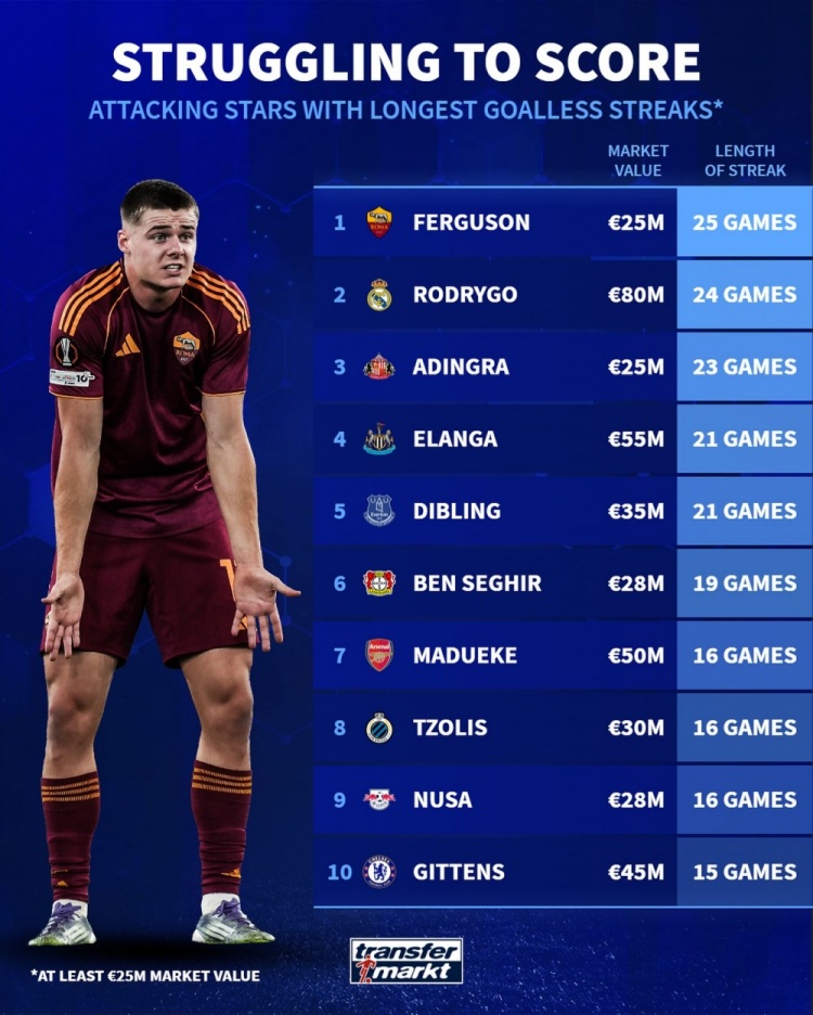 德转盘货环节球员进球荒:埃文-弗格森25场,罗德里戈24场
